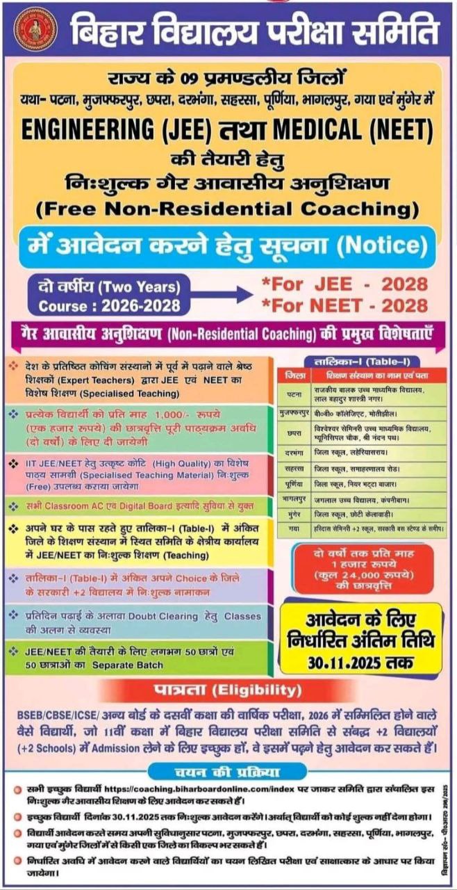 NEET-JEE Scholarship 2025 दोस्तों आज हम आपको बिहार नीट और जीई की तैयारी कर रहे स्टूडेंट्स के फ्री स्कालरशिप के बारे में बताने वाले है बिहार विद्यालय परीक्षा समिति ने एक बड़ा फैसला किया है। बिहार बोर्ड की देखरेख में मेडिकल और इंजीनियरिंग की तैयारी करने वाले छात्र-छात्राओं को प्रत्येक माह एक हजार रुपये की छात्रवृत्ति देगी। दो साल तक छात्र-छात्राओं को कुल 24 हजार की छात्रवृत्ति प्रदान की जाएगी। इस निशुल्क कोचिंग में पढ़ने के लिए इसका फायदा वैसे विद्यार्थी उठा सकते हैं जो अबतक आवेदन करने से वंचित रहे गए है। मेडिकल व इंजीनियरिंग की मुफ्त तैयारी कराने के लिए योग्य छात्र-छात्राओं का चयन प्रवेश परीक्षा व साक्षात्कार के आधार पर किया जाएगा। इसके लिए ऑनलाइन आवेदन जारी है