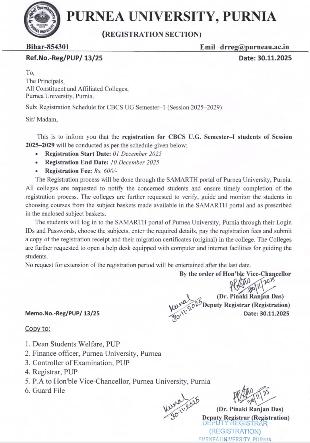 Purnea University UG Semester-1 Registration 2025-29 important Date:-